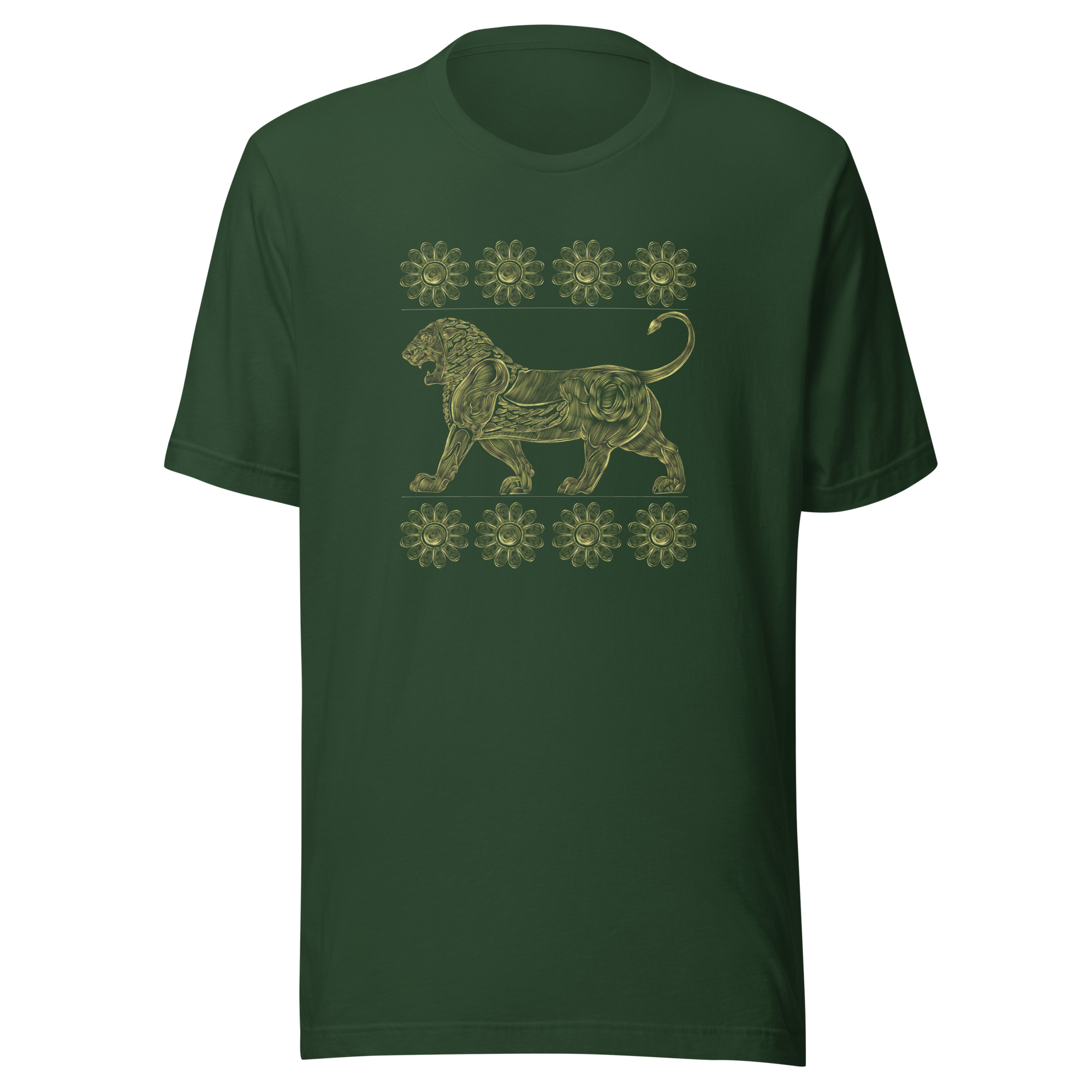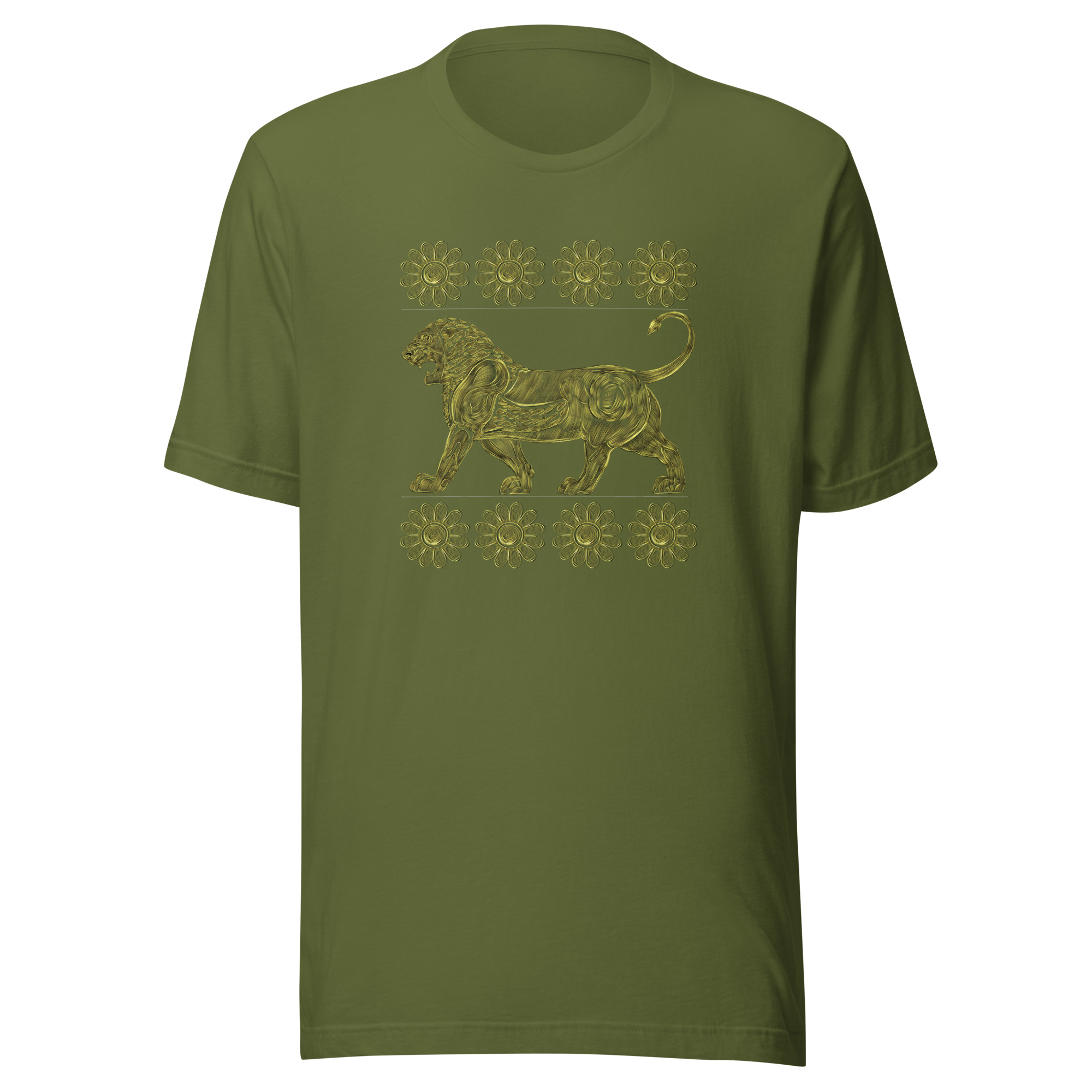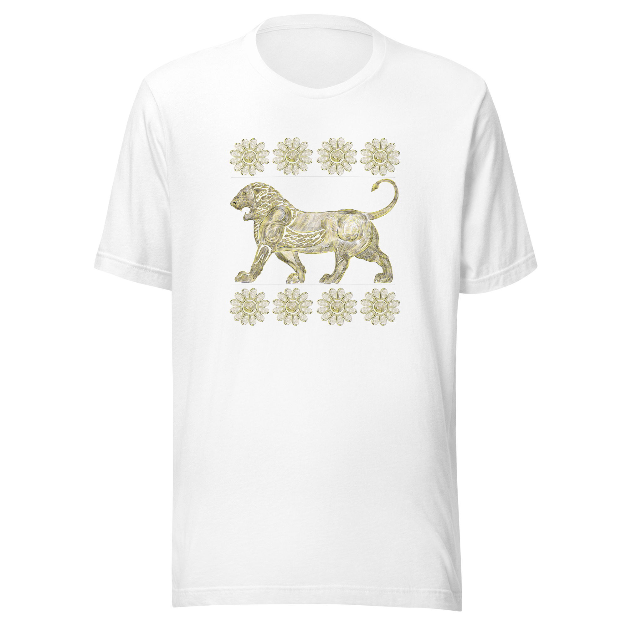 The design on this golden t-shirt features the lion and lotus flower, representing strength and purity, inspired by the Achaemenid Empire. The lion symbolizes courage and power, while the lotus flower signifies spiritual enlightenment. This artwork merges ancient Persian aesthetics with contemporary fashion, making it a unique addition to any wardrobe.